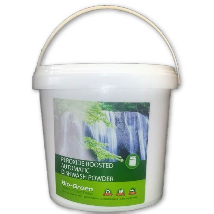Environmentally responsible dishwashing powder generates hydrogen peroxide as an active oxygenated bleach, stain remover and sanitiser. Phosphate free, septic safe, grey water safe and readily biodegradable. Bio Green peroxide boosted auto dishwash powdewr is a modern, auto dishwash powder formulated for use associated with septics and waste treatment plants. Traditional chlorine based dishwash powders and tablets put stresses on such biological systems. A peroxy salt is included to generate hydrogen peroxide as an active oxygen bleach, stain remover, deodoriser and sanitiser.