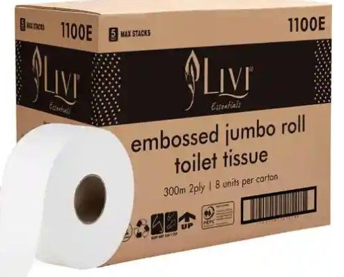 The Livi Essentials 1100E embossed jumbo toilet paper roll is jumbo sized for convenience and embossed for extra comfort. The oversized 300m toilet paper roll means less chance of run outs at inconvenient moments, and reduced frequency of refill changeovers which saves both time and money. The jumbo length toilet paper roll and bulk 8 pack buy makes it an economical and practical choice for high volume facilities looking for an executive quality consumable.