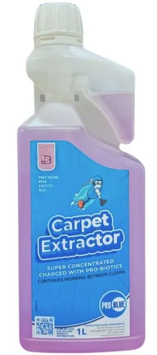 Pro Blue Carpet Extractor is a ‘probiotic cleaner’ formulated with bacteria to provide enhanced cleaning power that keeps working long after you put away your cleaning equipment. Quick drying, low foaming and no need to rinse.
