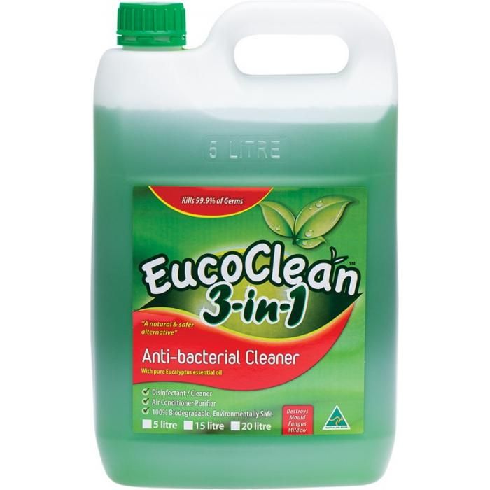 EucoClean 3-in-1 Antibacterial cleaner is a 100% biodegradable Hospital Grade biocide that destroys 99.99% of germs on contact as it cleans grime and grease from soft or hard surfaces. The Antibacterial action of the 3 in 1 formula stays active on the surface for hours or until degraded with water. Use in the home or office on all hard and soft surfaces. Spray and allow to dry or spray and wipe for a sanitised clean surface leaving the scent of pure Eucalyptus Oil.